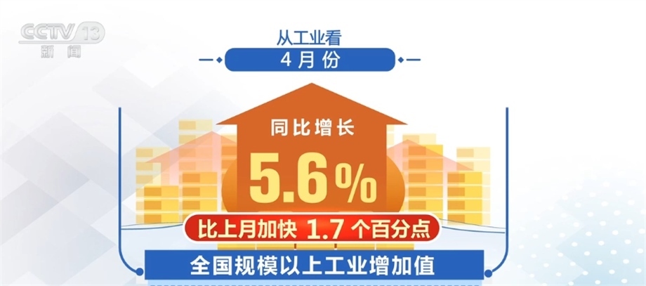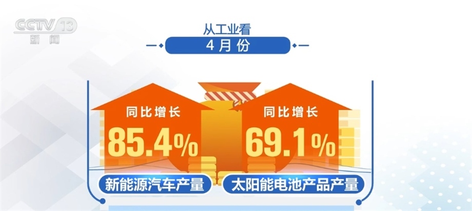 從工業(yè)看,4月份,全國(guó)規(guī)模以上工業(yè)增加值同比增長(zhǎng)5.6%,比上月加快1.7個(gè)百分點(diǎn),其中,新能源汽車、太陽(yáng)能電池產(chǎn)品產(chǎn)量同比分別增長(zhǎng)85.4%和69.1%。