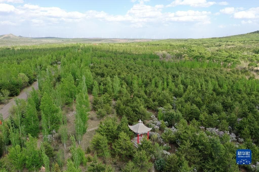 山西省右玉縣南山森林公園一角(5月18日攝,無人機照片)。