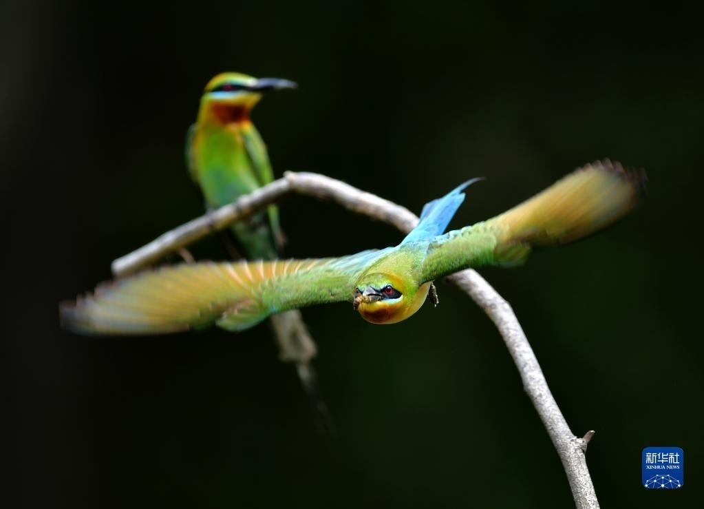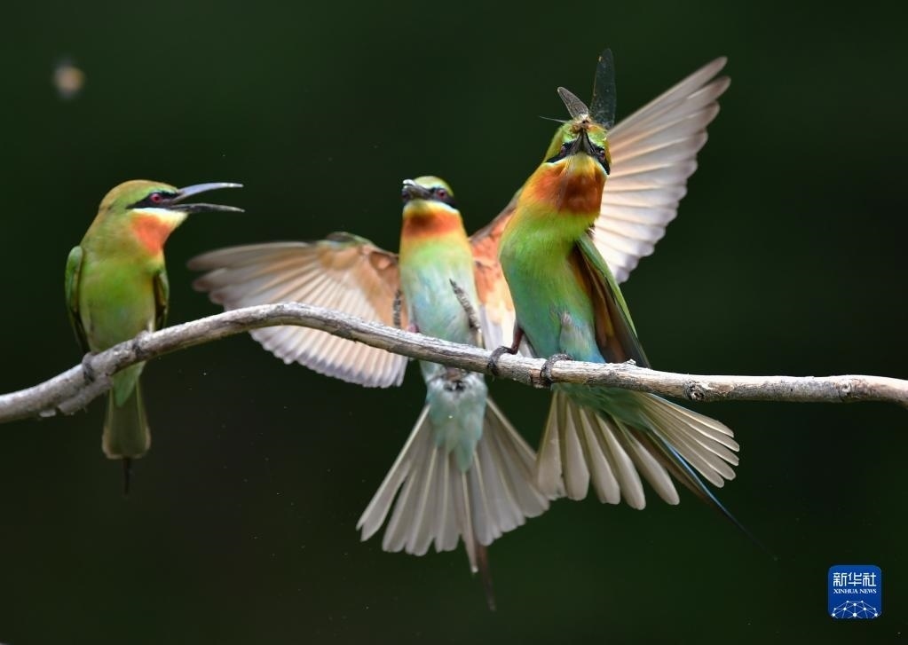 5月20日,兩只栗喉蜂虎在樹枝上玩耍。