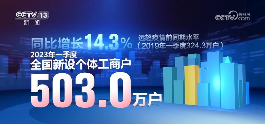 央視網(wǎng)消息:市場(chǎng)監(jiān)管總局5月22日發(fā)布最新數(shù)據(jù)顯示,2023年一季度,全國(guó)新設(shè)個(gè)體工商戶503.0萬戶,同比增長(zhǎng)14.3%,遠(yuǎn)超疫情前同期水平。