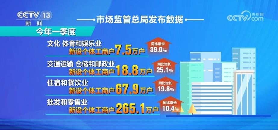 市場(chǎng)監(jiān)管總局發(fā)布數(shù)據(jù)顯示,今年一季度,文化、體育和娛樂業(yè),交通運(yùn)輸、倉(cāng)儲(chǔ)和郵政業(yè),住宿和餐飲業(yè),批發(fā)和零售業(yè)等行業(yè)新設(shè)個(gè)體工商戶分別為7.5萬戶、18.8萬戶、67.9萬戶、265.1萬戶,同比分別增長(zhǎng)39.0%、25.1%、19.8%、10.4%。