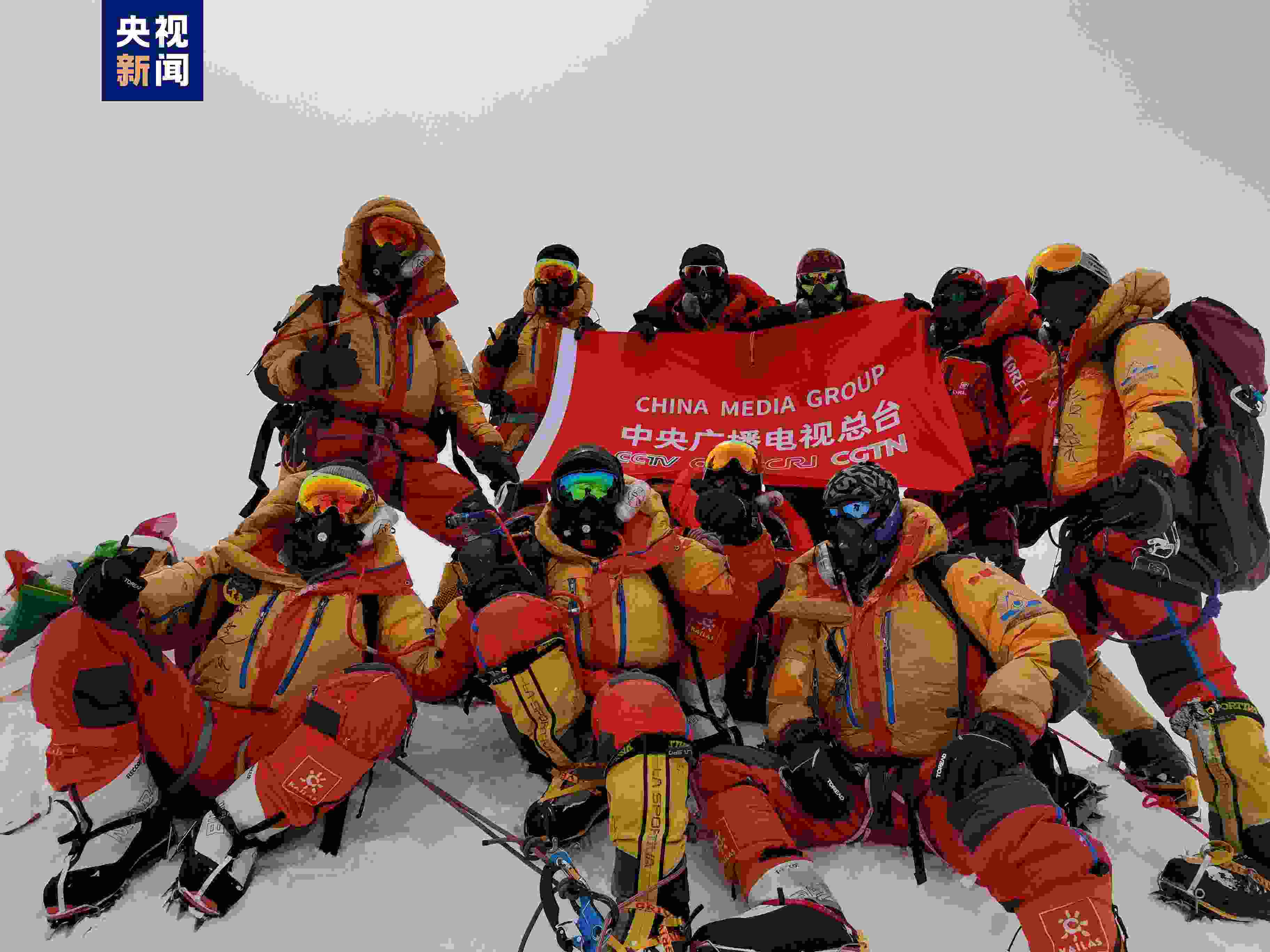 5月23日上午,2023“巔峰使命”珠峰科考登頂隊(duì)員在峰頂展示中央廣播電視總臺(tái)旗幟。