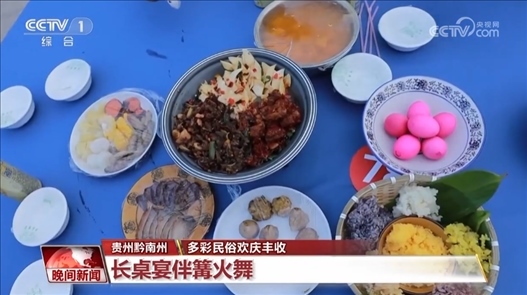 今年貴州省惠水縣的“四月八”相較以往更加熱鬧,來自貴州省黔南州12個(gè)縣(市)的千名少數(shù)民族同胞齊聚這里,共品長桌宴美食。鮮紅雞蛋、五色糯米飯、特色豆腐、惠水馬肉、辣子雞等一道道經(jīng)典特色的菜品被一一端上桌。少數(shù)民族同胞們圍著廣場大圓桌相互對(duì)唱,切磋歌藝。