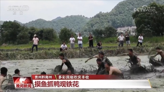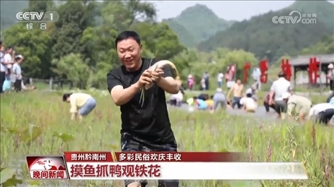 在貴州省長順縣白云山鎮(zhèn)中院村的荷花池里,當(dāng)?shù)厝罕姾陀慰?0多人一起抓魚,場面熱鬧非凡。與此同時(shí),隔壁廣順鎮(zhèn)核子村的抓鴨子比賽也在熱鬧地舉行。人們顧不上泥漿和水,跟鴨子斗智斗勇,引得觀眾陣陣歡笑。