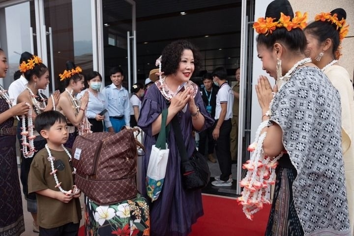 在中老鐵路老撾磨丁站,工作人員歡迎乘坐D887次國(guó)際旅客列車的旅客抵達(dá)磨丁(2023年4月13日攝)。新華社發(fā)(凱喬 攝)