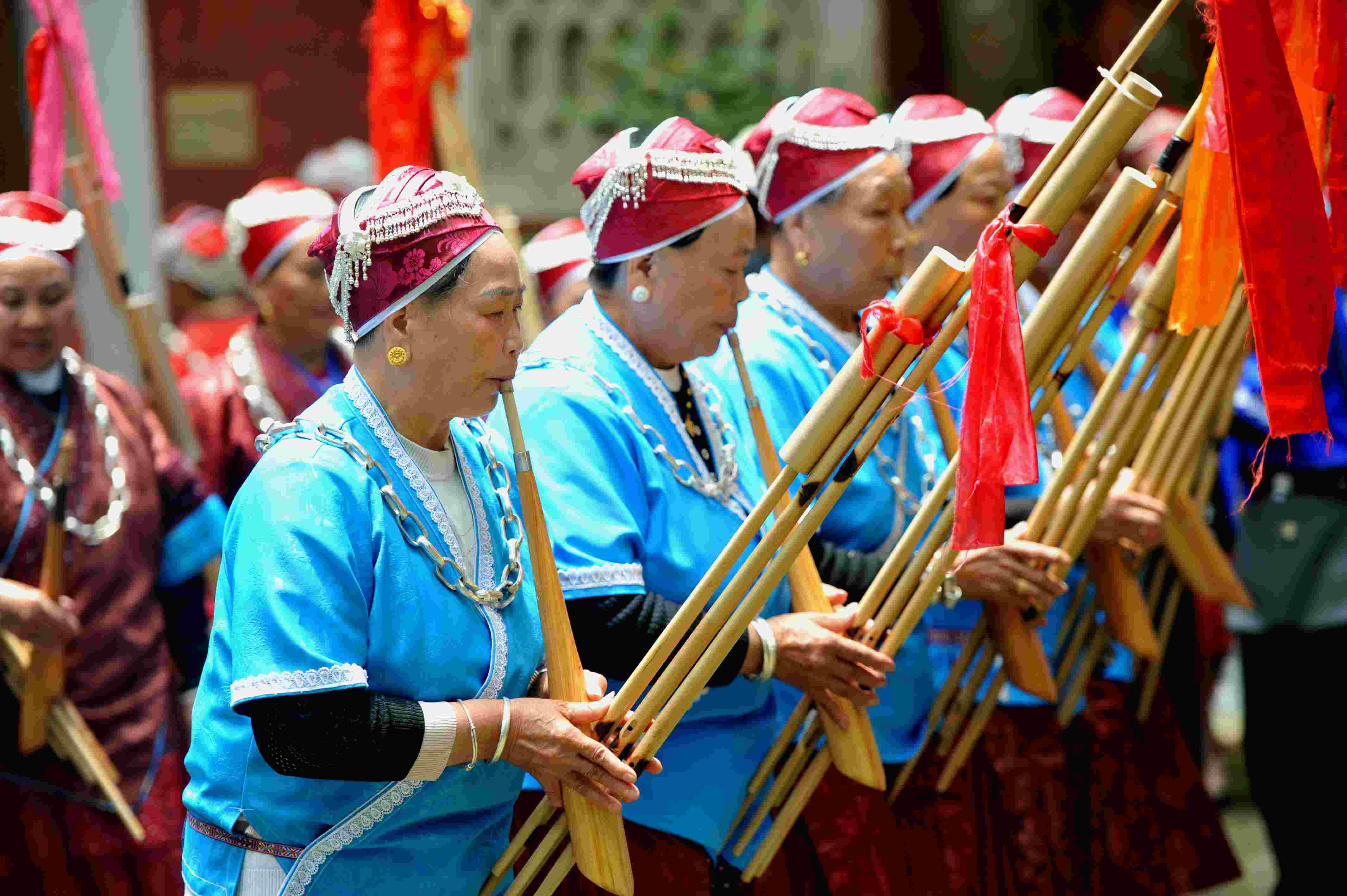 2023年5月26日,苗族同胞在貴州省黃平縣飛云崖景區(qū)吹奏蘆笙。 (寧堅(jiān) 楊忠)