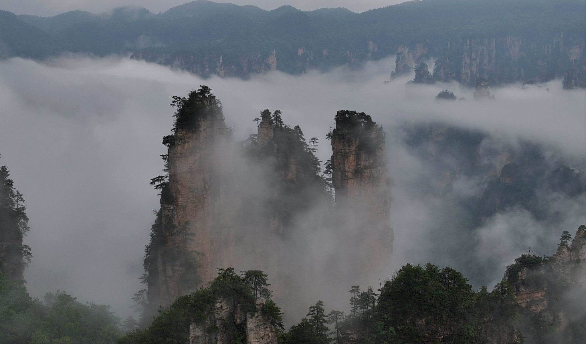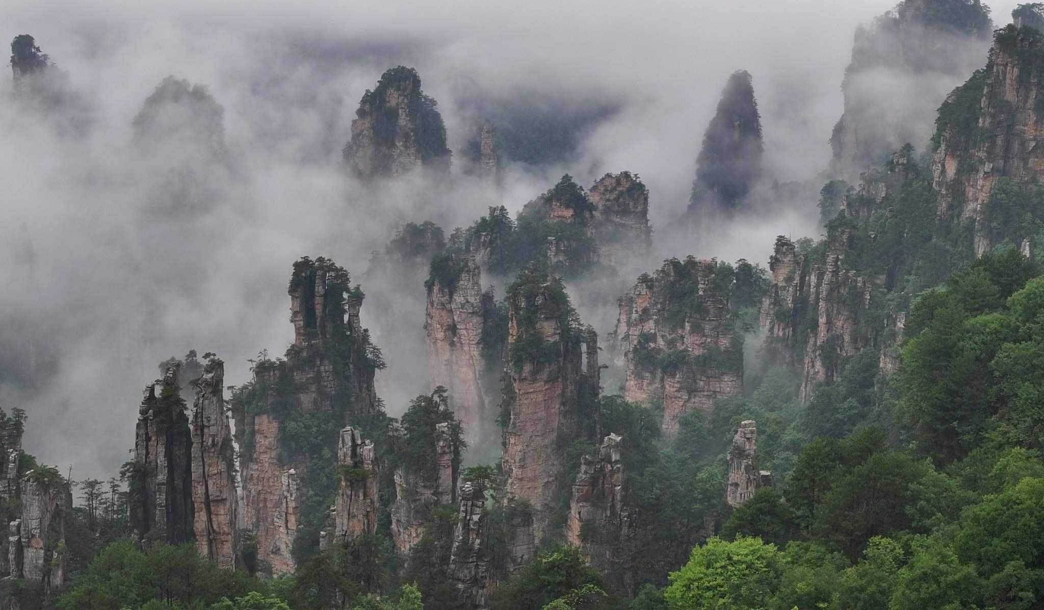 2023年5月27日,湖南張家界,國(guó)家森林公園天子山、十里畫廊出現(xiàn)雨后云海勝景,云霧在峰林間變幻飄逸,宛如水墨畫境。視覺中國(guó)