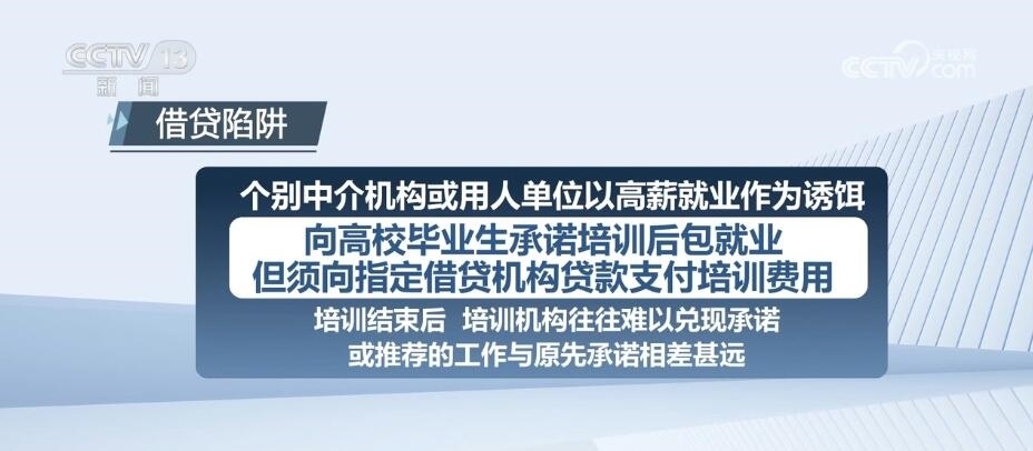 個別中介機構(gòu)或用人單位以高薪就業(yè)作為誘餌,向高校畢業(yè)生承諾培訓(xùn)后包就業(yè),但須向指定借貸機構(gòu)貸款支付培訓(xùn)費用。培訓(xùn)結(jié)束后,培訓(xùn)機構(gòu)往往難以兌現(xiàn)承諾,或推薦的工作與原先承諾相差甚遠(yuǎn)。