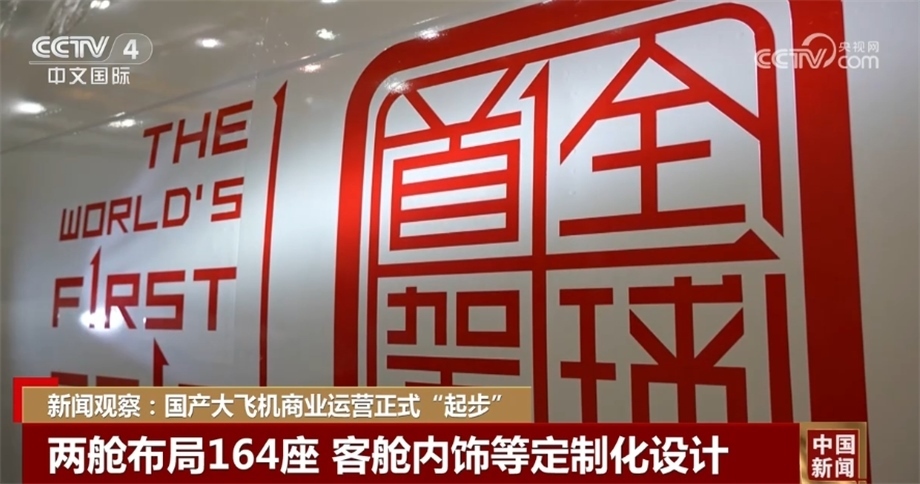今天執(zhí)行商業(yè)首飛的C919飛機為164座兩艙布局,公務(wù)艙8座,經(jīng)濟艙156座。客艙內(nèi)飾、旅客座椅、機載娛樂系統(tǒng)和飛機外部涂裝做了定制化設(shè)計。機身前部印有“全球首架”的“中國印”標(biāo)識和對應(yīng)英文。飛機注冊號B-919A,“B”代表飛機的中國國籍,“919”和型號名稱契合,“A”則有首架之意,突顯這一全球新機型、全球首架的非凡意義。