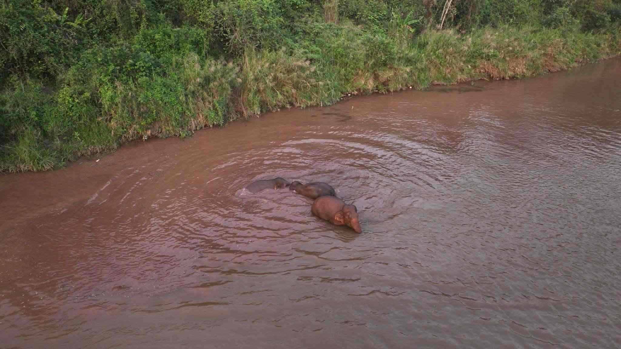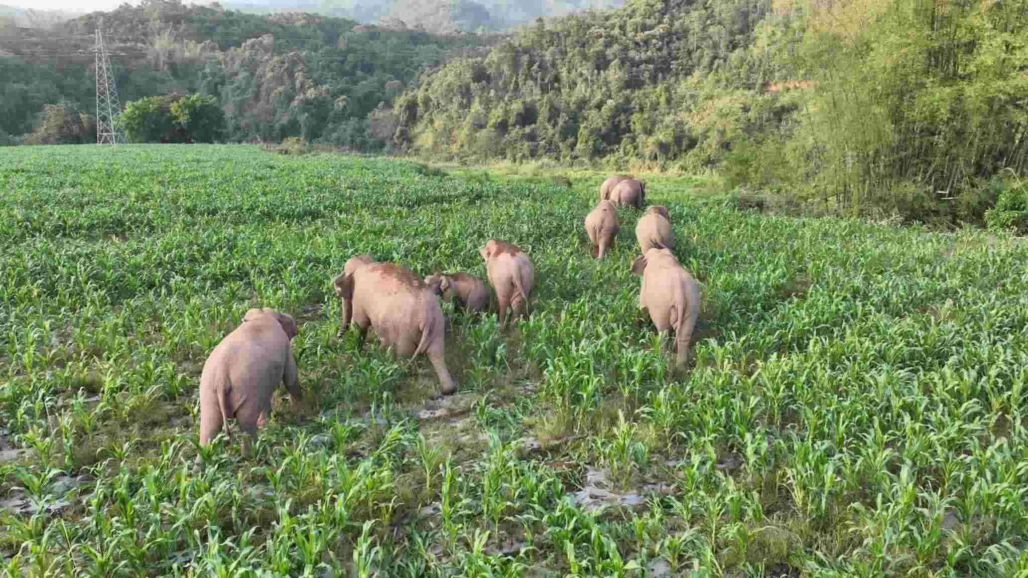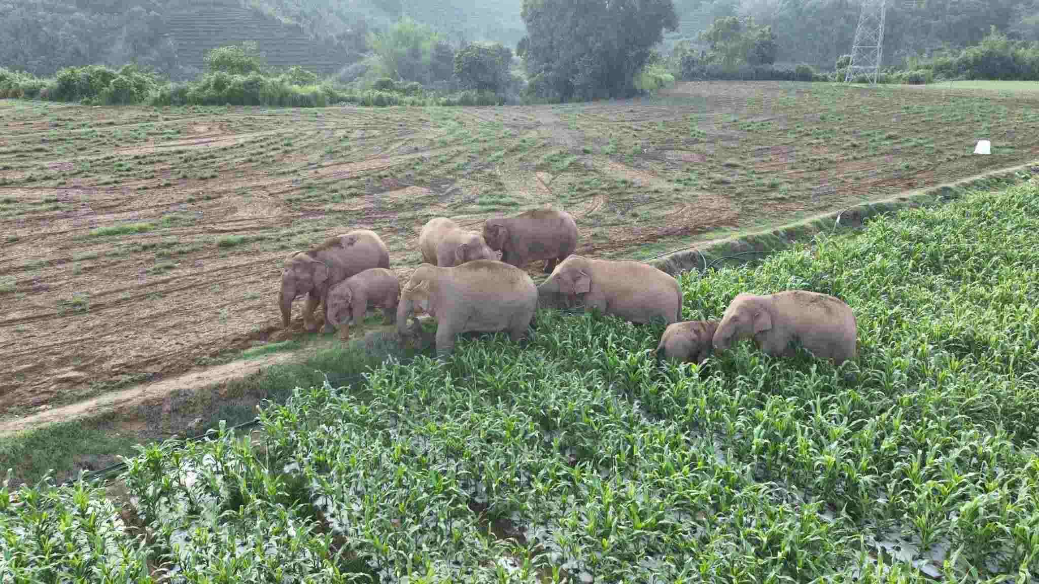 2023年5月17日,云南普洱,亞洲象群出山覓食戲水。視覺(jué)中國(guó)
