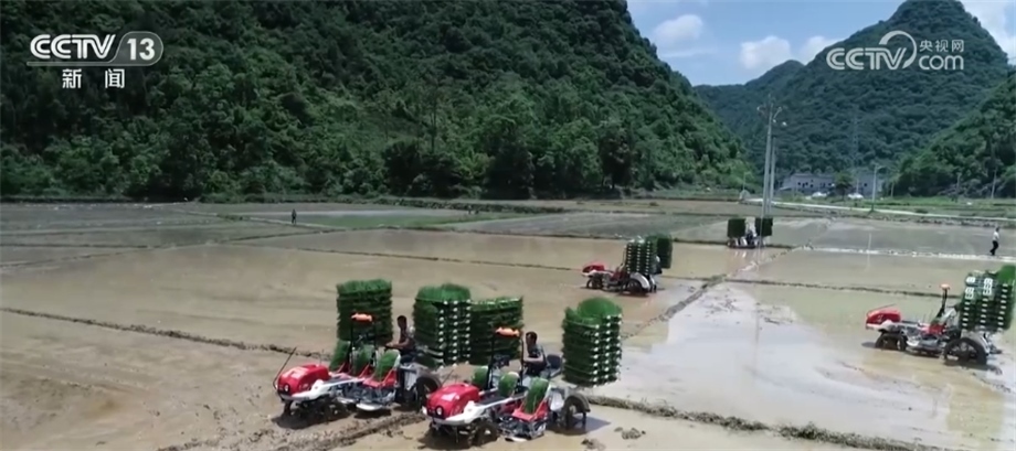 我們再到貴州省黔南州長順縣付家院村去看看。稻田里,多臺插秧機在農(nóng)機手的操作下,將一株株秧苗從苗盤整齊地栽種入田。今年,長順縣計劃種植水稻12萬畝,目前超過6成的水田完成了插秧,預(yù)計6月中旬能全部結(jié)束。
