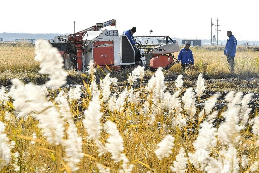 在吉林省大安市海坨鄉(xiāng)鹽堿地生態(tài)修復(fù)治理示范基地,農(nóng)民駕駛收割機(jī)收割水稻(2022年10月12日攝)。新華社記者 許暢 攝