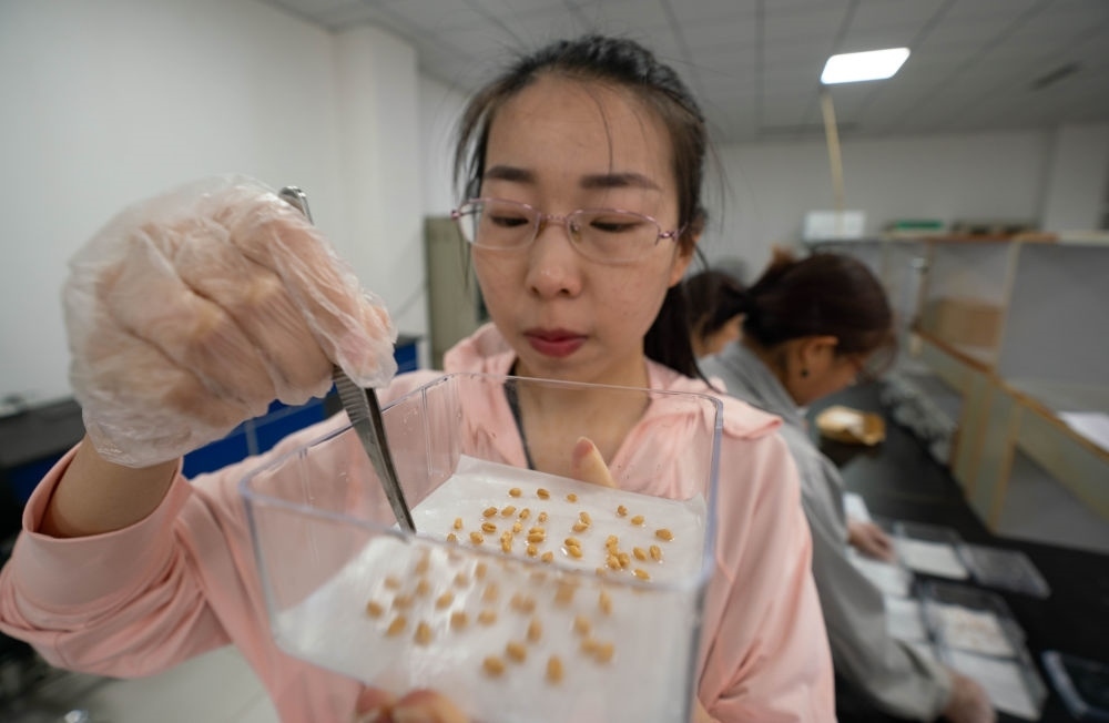 5月25日,在河北滄州渤海新區(qū)黃驊市中捷產(chǎn)業(yè)園區(qū)農(nóng)科所種子檢驗(yàn)室,技術(shù)人員在做小麥出芽率實(shí)驗(yàn)。新華社記者 駱學(xué)峰 攝