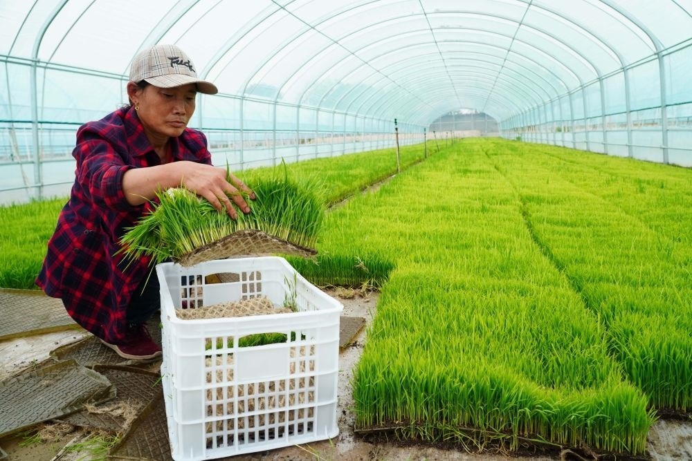 5月20日,山東省東營(yíng)市墾利區(qū)黃河口鎮(zhèn),農(nóng)戶在培育海水稻秧苗。新華社記者 徐速繪 攝