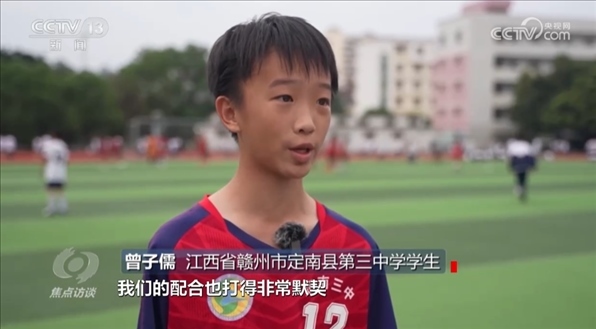 江西省贛州市定南縣第三中學學生曾子儒:“踢足球之前自己體弱多病,身體素質比較差,別提去踢這么一場激烈的足球比賽,就是讓我圍著操場跑一圈都氣喘吁吁?!?br>