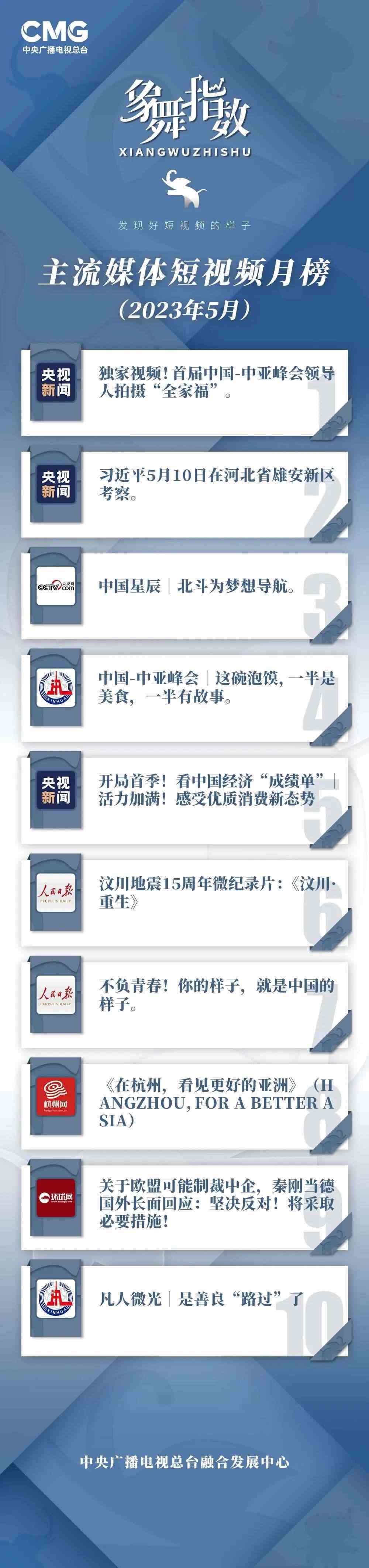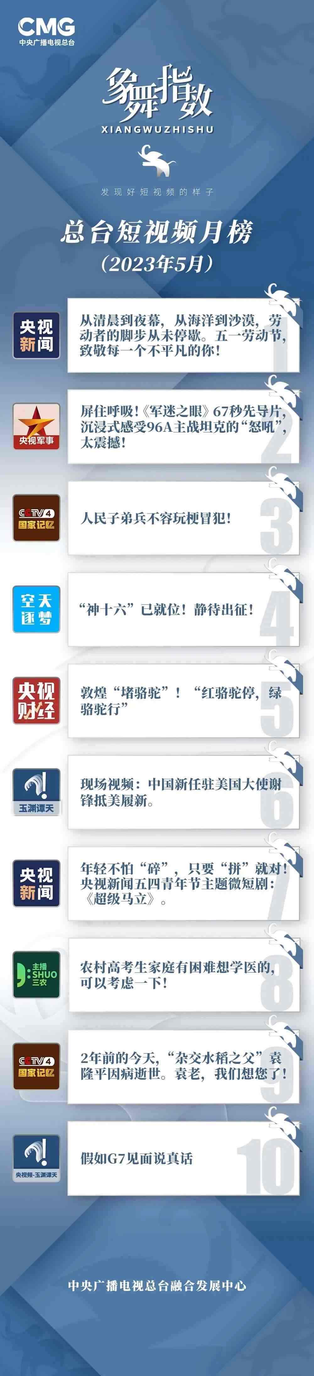 中央廣播電視總臺“象舞指數(shù)”評議品牌,推出主流媒體短視頻月榜、總臺短視頻月榜。在2023年5月,這些內(nèi)容引發(fā)大眾關注: