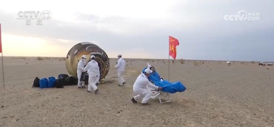 返回艙艙門打開后,醫(yī)監(jiān)醫(yī)保人員確認航天員身體健康。