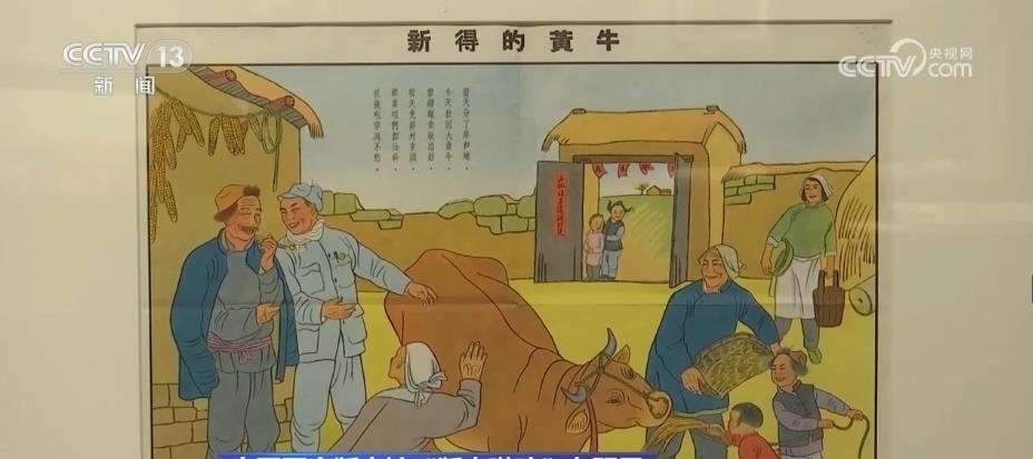 跟隨著講解員,再往前走,國家版本館的特色館藏——年畫、連環(huán)畫和宣傳畫出現(xiàn)在眼前。這面墻上和展柜集中展出了47幅新中國成立初期的新年畫。畫家李可染在1950年創(chuàng)作的《新得的黃?!返茸髌?,展現(xiàn)出老百姓感受到新中國新生活的幸福和美好。