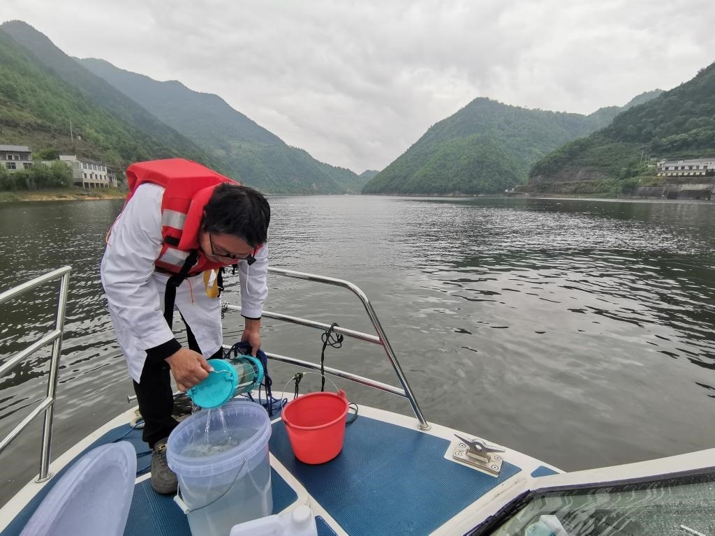 放下深水取樣器,待其沉入水下5米左右,再上提取水……近日,在新安江皖浙交界處,記者跟隨生態(tài)環(huán)保工作者乘船采樣、開展水質(zhì)監(jiān)測。