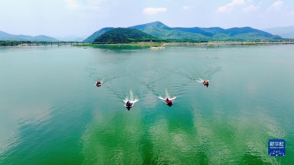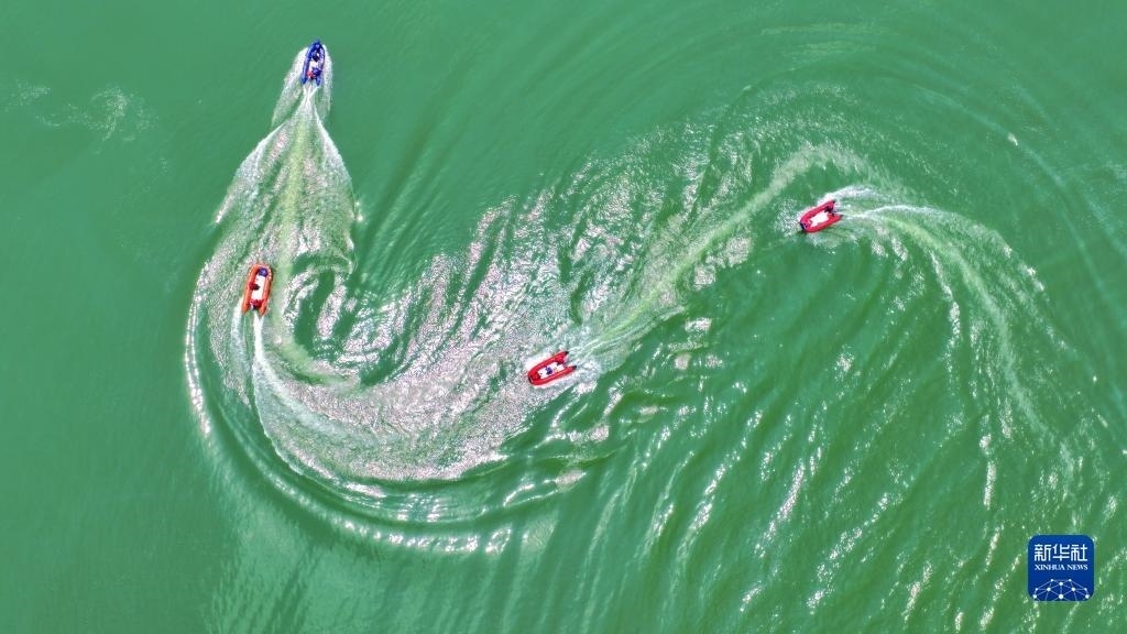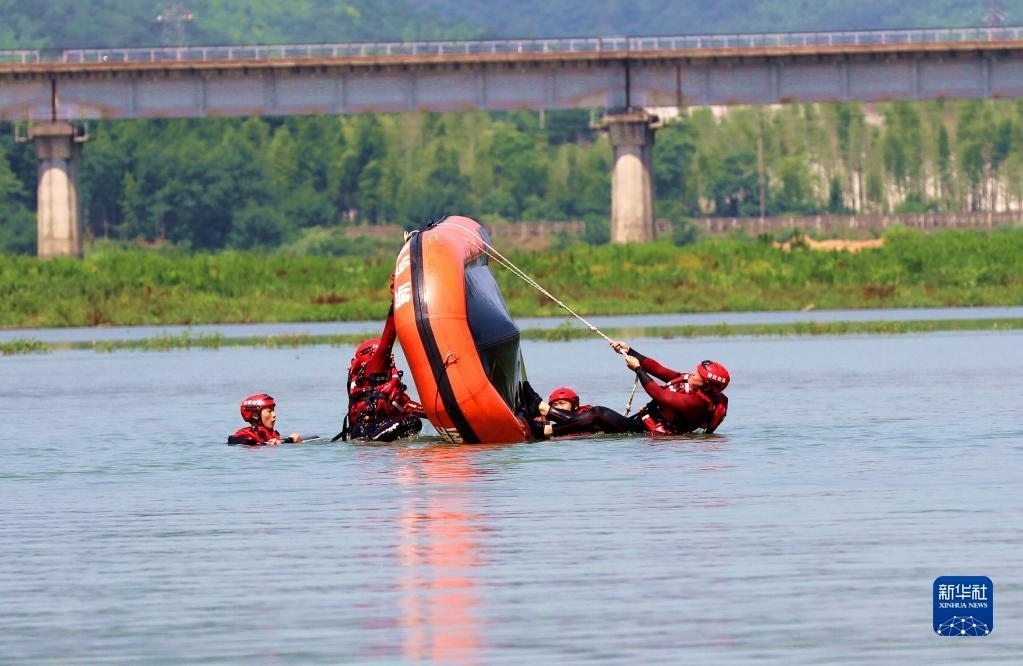 當(dāng)日,在浙江省湖州市長(zhǎng)興縣合溪水庫煤山段,煤山鎮(zhèn)組織黨員干部、應(yīng)急管理隊(duì)員、志愿者組成應(yīng)急救援隊(duì),開展防汛減災(zāi)應(yīng)急綜合實(shí)戰(zhàn)演練,通過沖鋒舟編隊(duì)、水上打撈、水上救援等課目訓(xùn)練,增強(qiáng)防汛應(yīng)急處置和水上搶險(xiǎn)救災(zāi)能力。新華社發(fā)(許旭 攝)