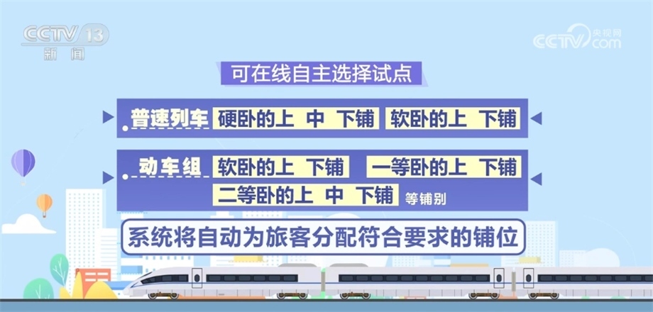 央視網(wǎng)消息:記者從國(guó)鐵集團(tuán)獲悉,今天(6月10日)起,鐵路部門將在12306網(wǎng)站和12306手機(jī)客戶端試行在線選鋪服務(wù)。