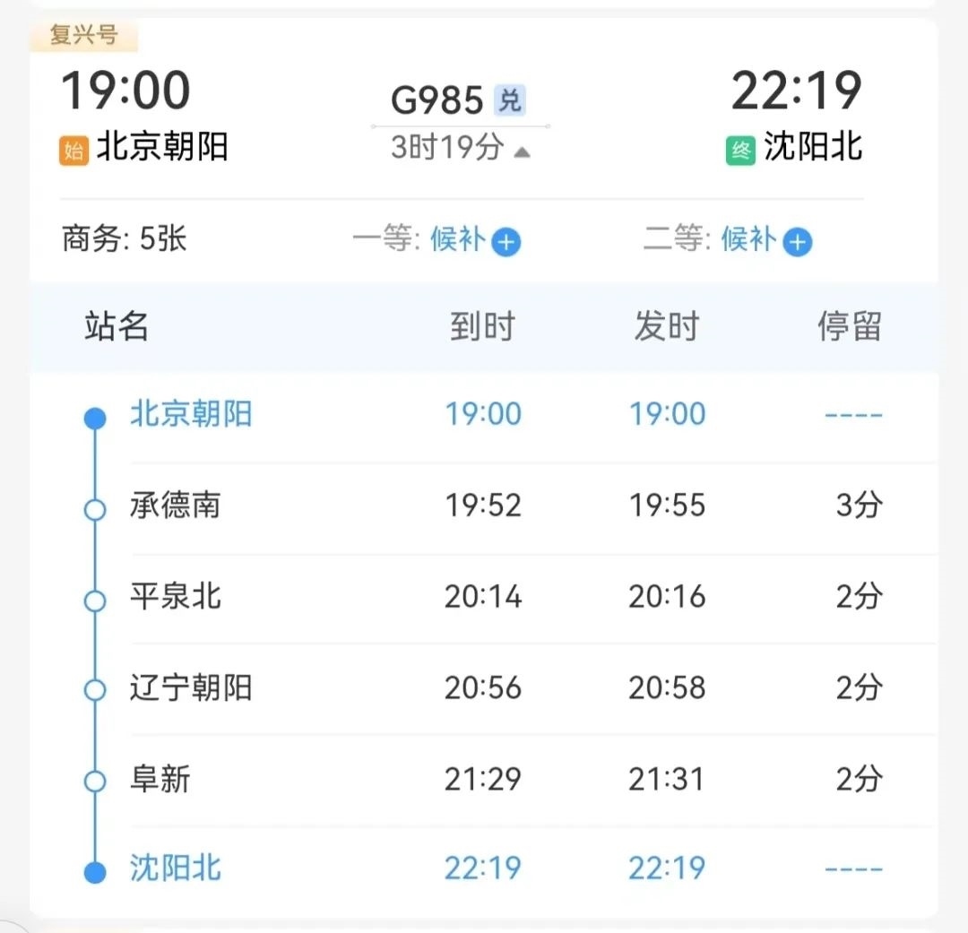 從北京朝陽(yáng)站開往沈陽(yáng)北站的
