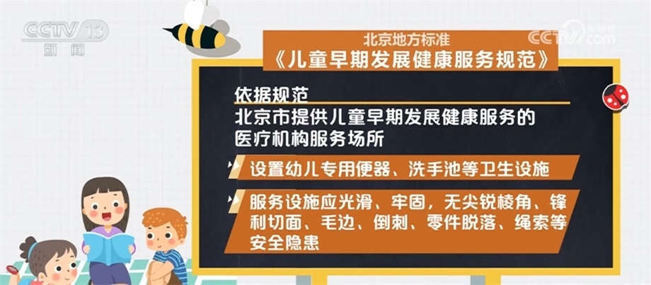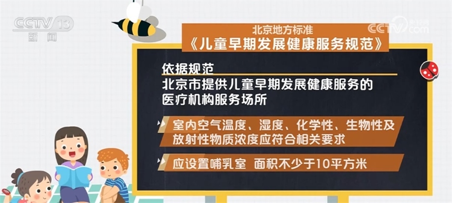 依據(jù)規(guī)范,北京市提供兒童早期發(fā)展健康服務的醫(yī)療機構服務場所應遠離各種污染源,采光充足,通風良好,遠離噪聲與電磁干擾;設置防蚊、蟲、蠅、鼠等設備,并放置于兒童無法接觸到的地方;室內(nèi)空氣溫度、濕度、化學性、生物性及放射性物質濃度應符合相關要求。應設置哺乳室,面積不少于10平方米;設置幼兒專用便器、洗手池等衛(wèi)生設施;服務設施應光滑、牢固,無尖銳棱角、鋒利切面、毛邊、倒刺、零件脫落、繩索等安全隱患。