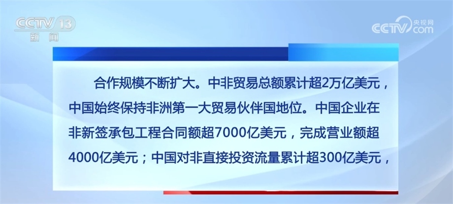 合作規(guī)模不斷擴大。中非貿(mào)易總額累計超2萬億美元,中國始終保持非洲第一大貿(mào)易伙伴國地位。中國企業(yè)在非新簽承包工程合同額超7000億美元,完成營業(yè)額超4000億美元;中國對非直接投資流量累計超300億美元,已成為非洲第四大投資來源國;向非洲國家派遣醫(yī)療隊員約9000人次,提供研修培訓名額超過10萬個,一批基礎設施和社會民生項目相繼建成。