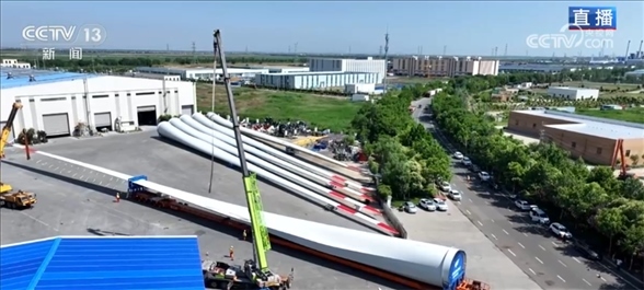 總臺(tái)央視記者 古峻嶺:我現(xiàn)在就在連云港生產(chǎn)超長(zhǎng)風(fēng)電葉片的這個(gè)廠區(qū)。我身后就是這場(chǎng)直播連線的主角——長(zhǎng)達(dá)123米的超長(zhǎng)海上風(fēng)電葉片,像這樣的葉片一共有3支,我們可以看到此刻它已經(jīng)完成了正式安裝前的所有檢測(cè)工作,剛剛吊裝到一輛65米長(zhǎng)的專用平板運(yùn)輸車上,即將開(kāi)啟陸地轉(zhuǎn)運(yùn)的第一步。