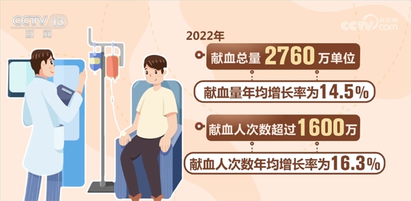 國(guó)家衛(wèi)生健康委相關(guān)負(fù)責(zé)人表示,我國(guó)無(wú)償獻(xiàn)血工作目前已形成了“政府主導(dǎo)、部門協(xié)作、社會(huì)支持、公眾參與”的格局,無(wú)償獻(xiàn)血制度全面建立,血液管理制度和規(guī)范標(biāo)準(zhǔn)體系不斷完善。全國(guó)建立了橫向到邊、縱向到底的血站采供血服務(wù)體系。全國(guó)共建設(shè)血站453家,形成以省級(jí)血液中心為龍頭、地市級(jí)中心血站為主體、中心血庫(kù)為補(bǔ)充的血站服務(wù)體系。我國(guó)血液安全保障水平大幅提升。全國(guó)無(wú)償獻(xiàn)血人次數(shù)和獻(xiàn)血量實(shí)現(xiàn)20多年持續(xù)增長(zhǎng),千人口獻(xiàn)血率由1998年的4.8提升至2022年11.5,2022年獻(xiàn)血總量2760萬(wàn)單位,獻(xiàn)血量年均增長(zhǎng)率為14.5%。2022年獻(xiàn)血人次數(shù)超過(guò)1600萬(wàn),獻(xiàn)血人次數(shù)年均增長(zhǎng)率為16.3%。今年1—5月,獻(xiàn)血人次數(shù)和獻(xiàn)血量比去年同期增長(zhǎng)7.7%和6%。