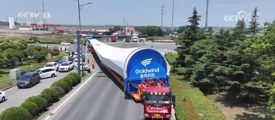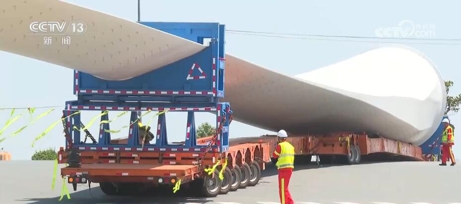 央視網消息:今天(6月14日)上午,100%我國自主知識產權的123米超長海上風電葉片在江蘇連云港啟動陸地轉運工作。上午9時,代表著我國風電裝備最新技術水準的大葉片,從廠區(qū)到港口碼頭,陸地運輸全程約30公里,耗時約3到4個小時,其中運輸大葉片的車輛還要拐過90度的直角彎。如此大體量的裝備運輸是一個復雜的過程,其中有哪些技術難點?來看記者今天上午從現(xiàn)場發(fā)回的報道。