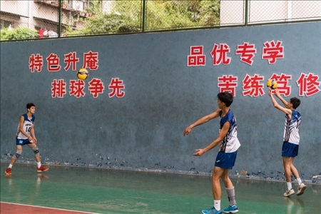 隨著下課鈴聲響起,學(xué)生們紛紛跑到操場上活動。操場一側(cè)是學(xué)校的排球訓(xùn)練館,二十幾名排球少年正在這里揮汗如雨地進行著每天的排球訓(xùn)練。目前,該校男排隊有8名隊員入選本屆四川省青年男排集訓(xùn)隊。