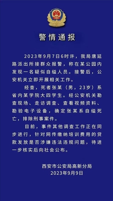 ·西安高新警方通報“大四學(xué)生自縊身亡”:排除刑案,正進(jìn)一步核實網(wǎng)傳貸款問題。