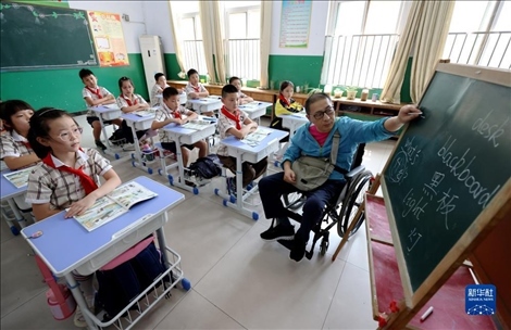今年48歲的楊季剛是山東省棗莊市永安鎮(zhèn)遺棠小學(xué)一名鄉(xiāng)村教師,從教已28年。2017年初,楊季剛因意外摔成重傷,終生將與輪椅為伴。靠著頑強(qiáng)的毅力,歷經(jīng)康復(fù)訓(xùn)練的艱辛,2018年秋季楊季剛?cè)缙诨氐搅诵@,在特制1米高的小黑板上頑強(qiáng)地續(xù)寫他的教師生涯。