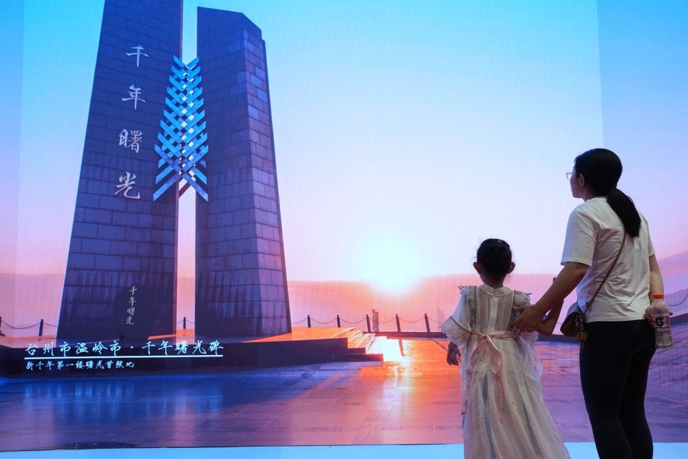 一對母女在杭州舉行的大道之行——“八八戰(zhàn)略”實(shí)施20周年大型主題展覽上觀看展示浙江建設(shè)成就的視頻(2023年9月9日攝)。新華社記者 翁忻旸 攝