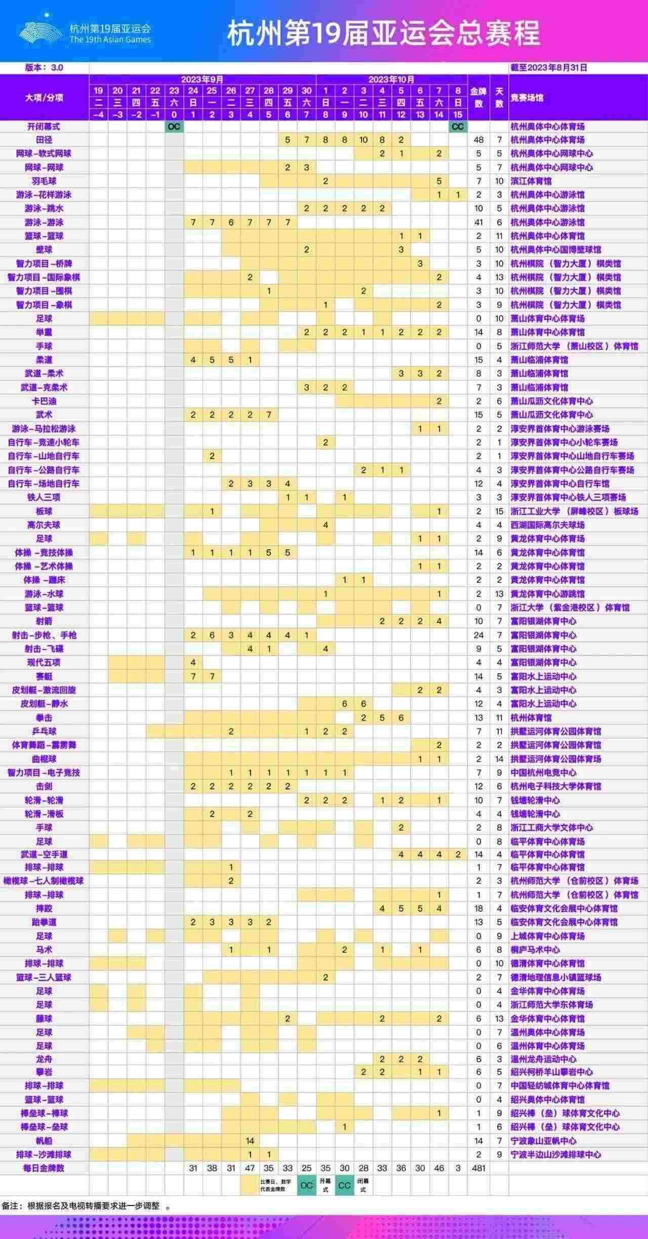 根據(jù)最新報(bào)名調(diào)整情況,經(jīng)杭州亞運(yùn)會(huì)各項(xiàng)目技術(shù)代表確認(rèn),杭州亞運(yùn)會(huì)總賽程已更新至3.0版。