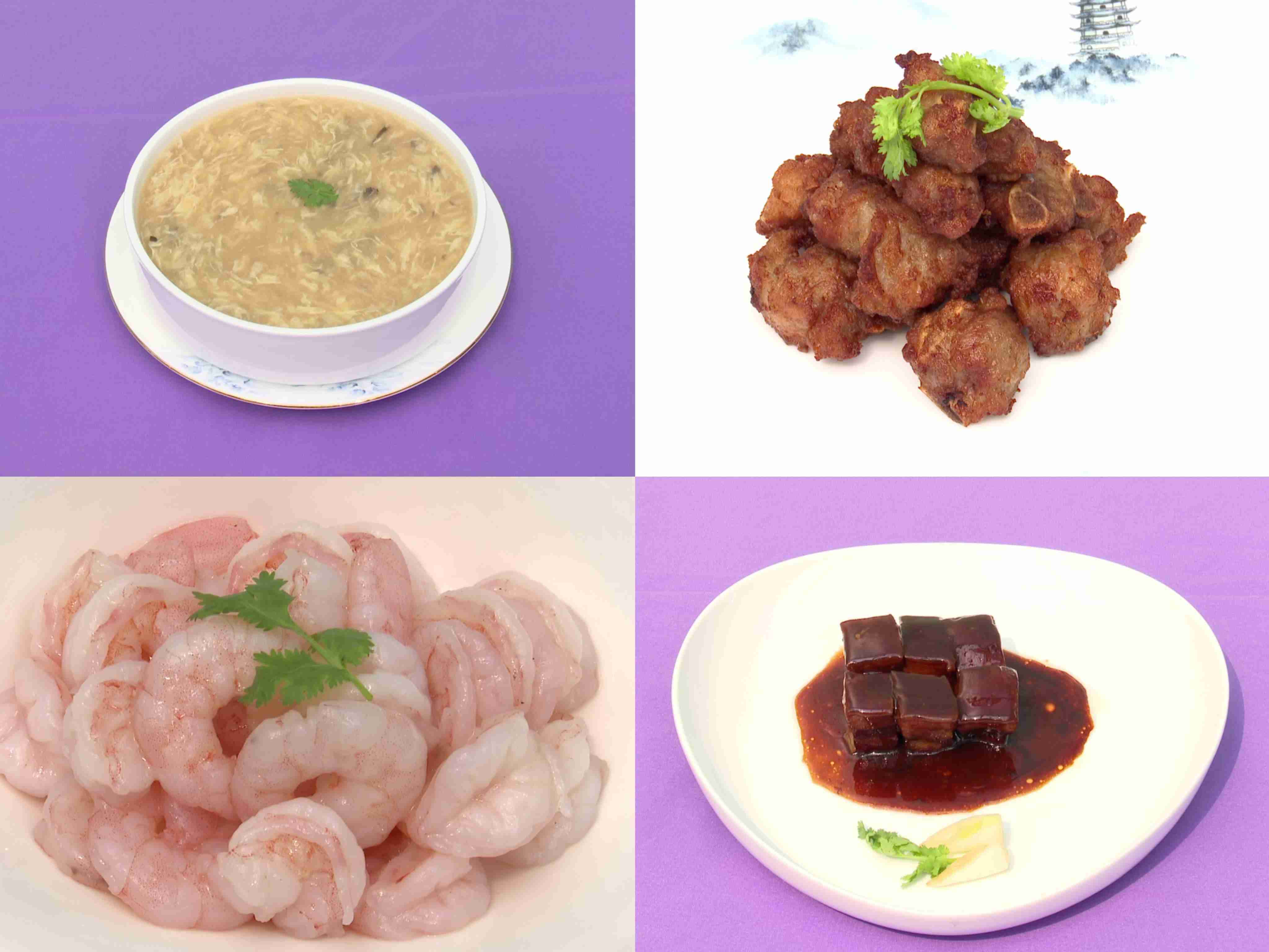 △左上:宋嫂魚(yú)羹;右上:蒜香肋排;左下:清炒蝦仁;右下:東坡肉。