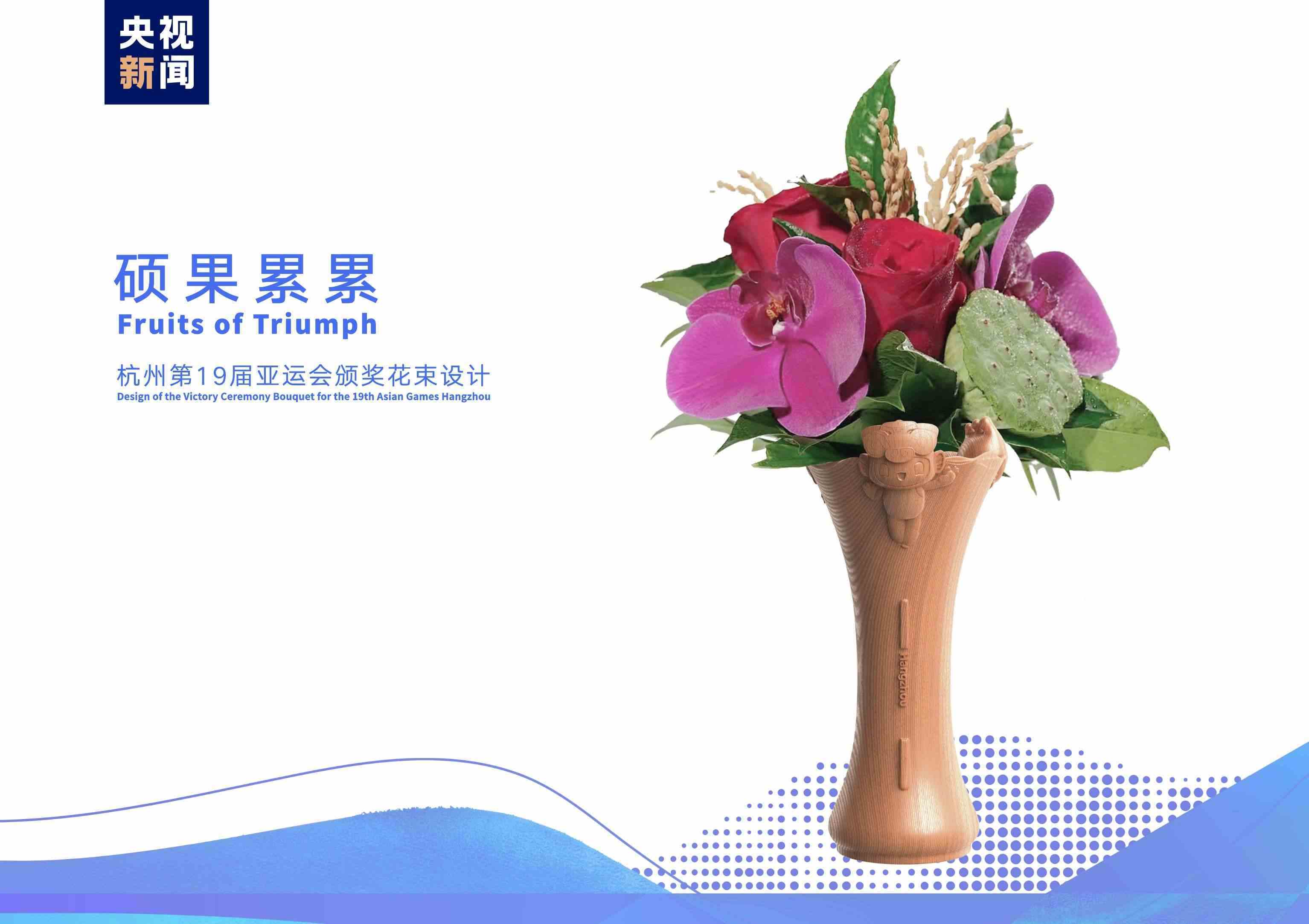 頒獎(jiǎng)花束名為“碩果累累”,花材以寓意豐收和成果的稻穗和蓮蓬,名為“赤子之心”的中國(guó)自育品種月季,代表亞運(yùn)“虹韻紫”的蝴蝶蘭,以及杭州特色植物龍井茶枝和桂花枝等組成,展現(xiàn)杭州獨(dú)特的文化內(nèi)涵和城市魅力。
