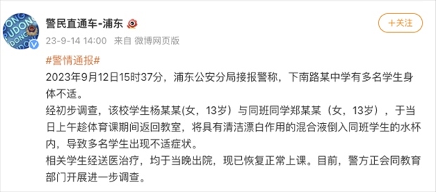 ·上海警方通報“中學生在校投放不明物質致同學飲用后送醫(yī)”。