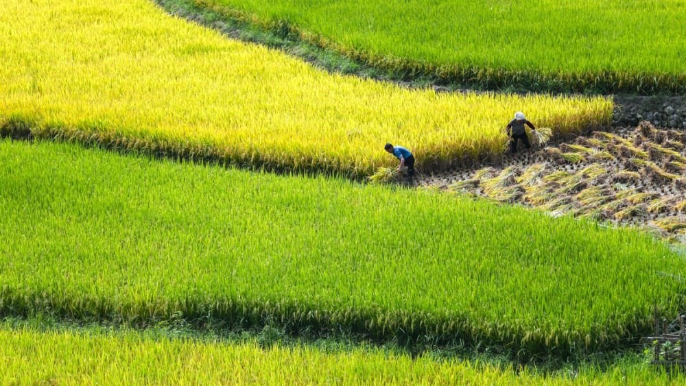↑2023年8月29日,貴州省黔東南苗族侗族自治州從江縣貫洞鎮(zhèn)貫洞村,農(nóng)民在田間收割稻谷。CICPHOTO/盧忠南 攝