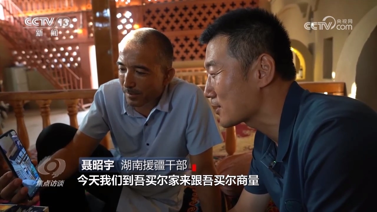 湖南援疆干部聶昭宇:“今天我們到吾買爾家跟吾買爾商量,在他們門前搞一個(gè)電商帶貨大比拼,現(xiàn)在這個(gè)村每天來(lái)了不少人,我們覺(jué)得前景挺好?!?/p>