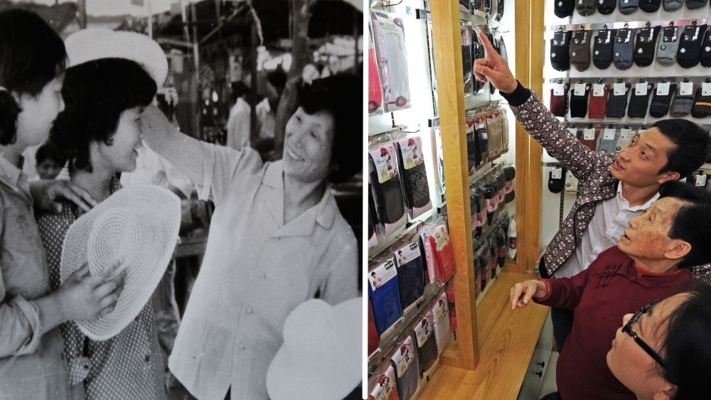 ↑拼版照片,左圖為:義烏小商品市場(chǎng)第一代經(jīng)營戶馮愛倩(右)在向顧客推銷遮陽帽(攝于上個(gè)世紀(jì)80年代);右圖為:2018年10月25日,78歲的馮愛倩(中)在傾聽她的孫子、義烏國際商貿(mào)城經(jīng)營戶楊帆(上)介紹他自產(chǎn)自銷的新款襪子。楊帆大學(xué)畢業(yè)后當(dāng)上了父親創(chuàng)辦的襪業(yè)公司的總經(jīng)理。