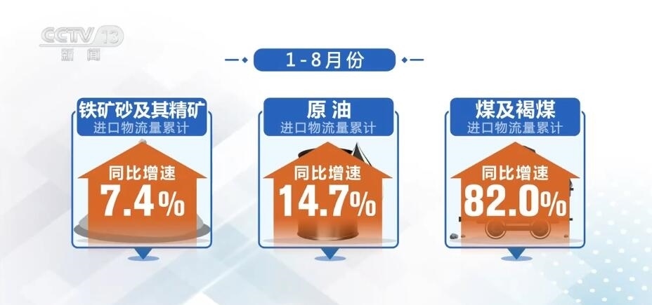 從進口來看,隨著內需改善,進口物流也呈現(xiàn)量價回升。1—8月份進口物流總額同比增長14.4%,增速持續(xù)回升。從產(chǎn)品結構看,原材料等大宗商品進口增速有所加快,鐵礦砂及其精礦、原油、煤及褐煤進口物流量累計同比增速分別為7.4%、14.7%、82.0%。