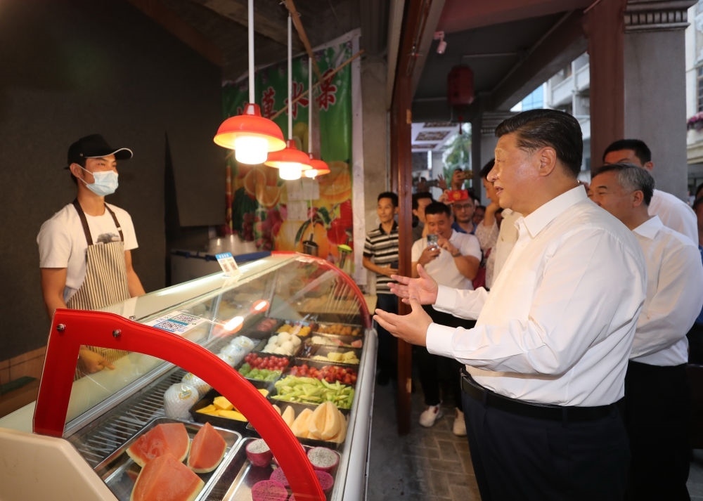 2020年10月13日,習(xí)近平在廣東省汕頭市步行察看小公園開埠區(qū)街區(qū)人文歷史風(fēng)貌時(shí),同現(xiàn)場(chǎng)群眾親切交流。