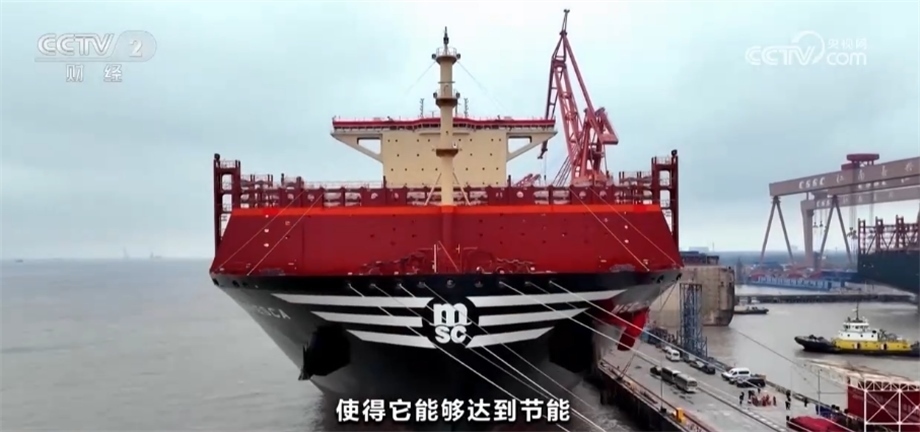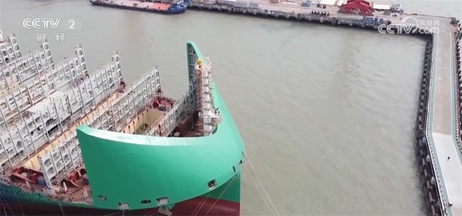 總臺央視記者 孟湛東:我現(xiàn)在是在中國船舶滬東中華造船廠的一艘13000箱的雙燃料集裝箱船上。這艘船除了使用傳統(tǒng)的石油燃料之外,還引入了液化天然氣,可以直接降低28%以上的溫室氣體排放。除此之外,在船頭還有一個獨特的設(shè)計,各位可以看到一個綠色的防風(fēng)罩,工人們親切地稱它“綠頭怪”,這樣的設(shè)計可以讓船舶在正常行駛當(dāng)中降低2%左右的燃料消耗。