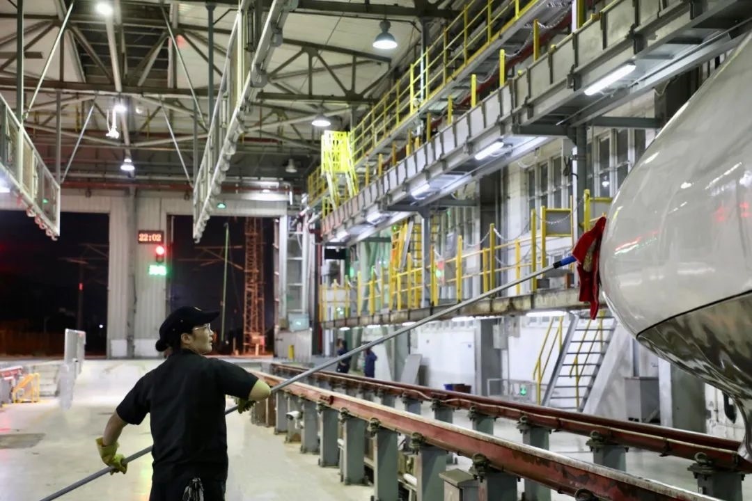 動車組經(jīng)過洗車機時,調(diào)度室內(nèi)調(diào)度員精準聯(lián)控司機,機房有專業(yè)的設備操作人員負責監(jiān)控,確保洗車機正常運轉(zhuǎn),外皮清洗到位。在動車檢修庫內(nèi),質(zhì)檢員全方位卡控人工清洗環(huán)節(jié),檢查清潔是否到位。