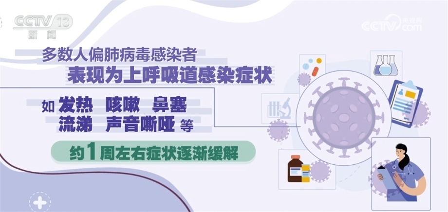 《人偏肺病毒感染診療方案(2023年版)》指出,人偏肺病毒感染者是主要傳染源。從潛伏期末到急性期都有傳染性。主要通過飛沫和密切接觸傳播,也可以通過接觸被病毒污染的物品間接傳播。人偏肺病毒人群普遍易感,在5歲以下兒童、老年人和免疫功能低下的人群中更為多見,潛伏期為3天—9天,多為3天—6天。多數(shù)人偏肺病毒感染者表現(xiàn)為上呼吸道感染癥狀,如發(fā)熱、咳嗽、鼻塞、流涕、聲音嘶啞等,約1周左右癥狀逐漸緩解。鑒于目前尚無證據(jù)證明有對人偏肺病毒有效的特異性抗病毒藥物,不建議使用抗病毒藥物進行治療。避免盲目或不恰當(dāng)使用抗菌藥物,尤其是聯(lián)合使用廣譜抗菌藥物。