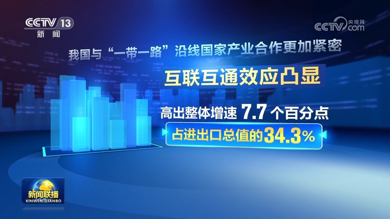 我國(guó)與“一帶一路”沿線國(guó)家產(chǎn)業(yè)合作更加緊密,互聯(lián)互通效應(yīng)凸顯,進(jìn)出口同比增長(zhǎng)9.8%,高出整體增速7.7個(gè)百分點(diǎn),占進(jìn)出口總值的34.3%。
