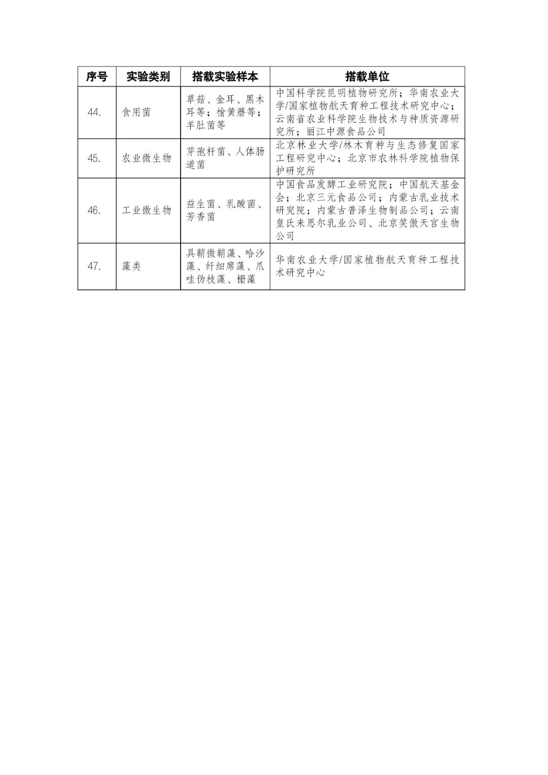 載人航天工程立項實施以來,始終注重提升工程綜合效益,致力服務(wù)國家經(jīng)濟(jì)社會發(fā)展。在工程歷次飛行任務(wù)中,均安排了航天育種搭載實驗項目。從神舟十六號載人飛船開始,中國載人航天工程辦公室向社會公開征集航天育種搭載實驗項目,于3月23日在工程官網(wǎng)發(fā)布《關(guān)于征集神舟系列載人飛船航天育種實驗項目的機(jī)會公告》,同時在工程官網(wǎng)開辟“航天育種搭載實驗”管理平臺,接受搭載需求單位申報實驗項目。辦公室組織專家對申報項目進(jìn)行評審,遴選出53個單位的136種份航天育種實驗材料實施搭載。包括農(nóng)作物47份(糧食作物種子12份、經(jīng)濟(jì)作物種子28份、耐鹽堿植物7份);林草、花卉和藥用植物76份(林木17份、飼草21份、花卉7份、藥用植物31份);微生物和其它13種(農(nóng)業(yè)微生物菌種2種、工業(yè)微生物菌種3種、食用菌3種、藻類和苔蘚5種)(清單附后)。