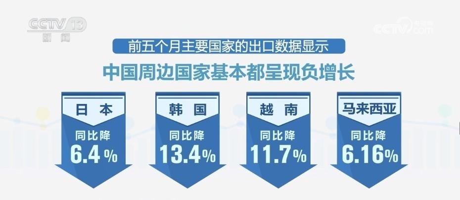 當(dāng)記者查閱主要國家前5個月的進口數(shù)據(jù)時發(fā)現(xiàn),主要國家進口額普遍下降,全球需求不振持續(xù)顯現(xiàn)。而前5個月主要國家的出口數(shù)據(jù)也顯示,中國周邊國家基本都呈現(xiàn)負增長,日本同比降6.4%、韓國同比降13.4%、越南同比降11.7%、馬來西亞同比降6.16%。